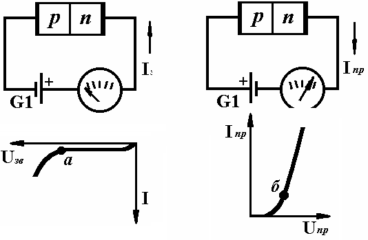Безперечно, описана картина цілковитого припинення протікання струму через напівпровідник можлива лише за умови ідеальної чистоти як самого напівпровідника, так і донорних та акцепторних домішок. Реально, в напівпровіднику завжди наявні інші домішки, хоч і в незначній кількості. Саме тому через р-п перехід усе-таки протікає незначний електричний струм. Графік зворотного струму напівпровідникового діода зображено на рис. 9. Тут добре видно, що при збільшенні зворотної напруги до певної величини (точка а), суттєвого збільшення сили струму не спостерігається. Поза цією точкою струм починає різко зростати, внаслідок чого може настати електричний пробій напівпровідника.