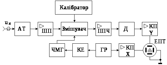Досліджуваний сигнал ux(t) через Вхід Y подається на атенюатор або безпосередньо (відкритий вхід), або через розділювальний конденсатор С (закритий вхід). Якщо вхід відкритий, то в канал вертикального відхилення проходять як змінна, так і постійна складові сигналу. В противному разі через конденсатор С проходить тільки змінна складова сигналу. Вихідний сигнал атенюатора підсилюється широкосмуговим підсилювачем ШП і подається, по-перше, через лінію затримки і підсилювач вертикального відхилення ПВВ на вертикально відхильні пластини ЕПТ, і по-друге, - в канал горизонтального відхилення променя для синхронізації генератора розгортки.