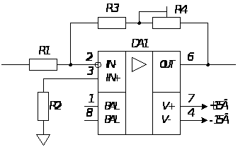 В качестве входной части используется повторитель напряжения на операционном усилителе для обеспечения необходимого значения входного сопротивления.