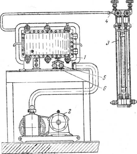 1 —камера; 2 —насос; 3 — дифференциальный манометр; 4 — соединительный штуцер; 5 — вентиль контроля давления; 6 — вентиль регулировки давления.