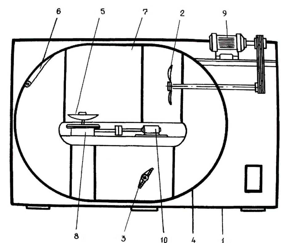 Собственно испытательной камерой является средняя верхняя секция трубопровода 7, соединенная правым фланцем с патрубком из плотной ткани с секцией вентилятора. Вращение осевого вентилятора со скоростью 1450 об/мин осуществляется электродвигателем 9 АОЛ2-41-4 мощностью 4 квт, связанным с ним через клиноременную передачу. Электродвигатель закреплен на амортизирующих прокладках для уменьшения шума и вибрации. Левым фланцем испытательная камера соединяется с секцией, в которой находится направляющий щит 6, предназначенный для создания равномерного воздушного потока. В нижней части воздухопровода вмонтирована секция с расположенным в ней шибером (заслонкой) 3 для регулирования скорости воздушного потока. Регулирование равномерности и скорости воздушного потока производится рукоятками направляющего щита и шибера, выведенными на переднюю стенку камеры и фиксируемыми в определенном положении. Для установки испытываемых изделий и равномерного их обдува со всех сторон в нижней части испытательной камеры расположен вращающийся в горизонтальной плоскости стол 5, закрепленный на вертикальном валу редуктора и делающий 9 об/мин. Редуктор установлен под испытательной камерой и соединен эластичной муфтой с электродвигателем 10. На передней стенке камеры имеется дверной проем, закрываемый дверью со смотровым окном и резиновым уплотнением. Под дверью помещается щит управления с размещенными на нем выключателями сети и подогрева, переключателем освещения камеры, кнопок пуска и остановки электродвигателей. Магнитные пускатели 11 электродвигателей размещаются внутри установки. В потолке камеры установлена электролампа, защищенная от воздействия пыли стеклом. На задней стенке камеры помещается панель с размещенным на ней штепсельным разъемом питания. В нижней секции воздухопровода предусмотрено место для электроподогревателя, который в комплект установки не входит.