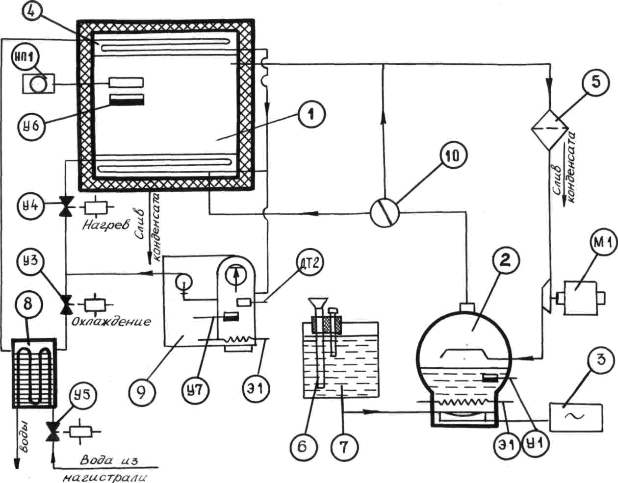 1 — излучатель инфракрасных лучей; 2 — излучатель ультрафиолетовых лучей; 3 — стол для испытуемых изделий; 4 — щит коммутации с блокировкой; 5 — блок электрического питания; 5 — щит питания; 7 — щит управления и сигнализации; 8 — коллектор; 9 — привод стола.