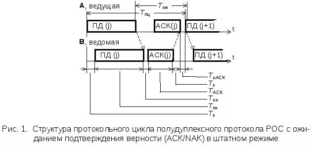 Как следует из рис. 1, в отсутствие ошибок в каналах время передачи пакета данных под управлением рассматриваемого протокола равно длительности протокольного цикла Т>пц>. Как уже было отмечено, в этом времени цикла можно выделить долю «полезного», «чистого» времени, связанного с транспортировкой бит данных, и есть время, которое должно быть отнесено к «накладным расходам», обусловленным особенностями протокола.