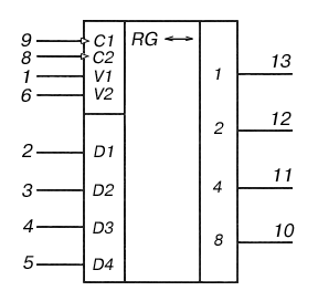 1 – информационный вход V1; 2 – в ход первого разряда D1; 3 – вход второго разряда D2; 4 – вход третьего разряда D3; 5 – вход четвертого разряда D4; 6 – вход выбора режима V2; 7 – общий; 8 – вход синхронизации C2; 9 – вход синхронизации C1; 10 – выход четвертого разряда; 11 – выход третьего разряда; 12 – выход второго разряда; 13 – выход первого разряда; 14 – напряжение питания;