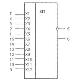 Назначение выводов: 1, 2, 3, 4, 7, 9, 10, 11, 12, 13, 14, 15 – входы; 5, 6 – выходы; 8 – общий; 16 – напряжение питания.