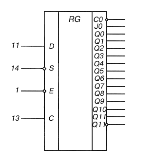 1 – инверсный вход Е (разрешение); 2 – выход J0; 3 – инверсный выход С (завершение преобразования); 4 – выход Q0; 5 – выход Q1; 6 – выход Q2; 7 – выход Q3; 8 – выход Q4; 9 – выход Q5; 10,15,22 – свободные; 11 – вход данных D; 12 – общий; 13 – вход С (тактовый); 14 – инверсный вход S (пуск); 16 – выход Q6; 17 – выход Q7; 18 – выход Q8; 19 – выход Q9; 20 – выход Q10; 21 – выход Q11; 23 – инверсный выход Q11; 24 – напряжение питания;