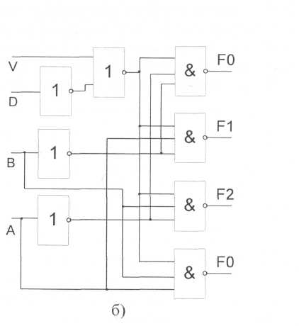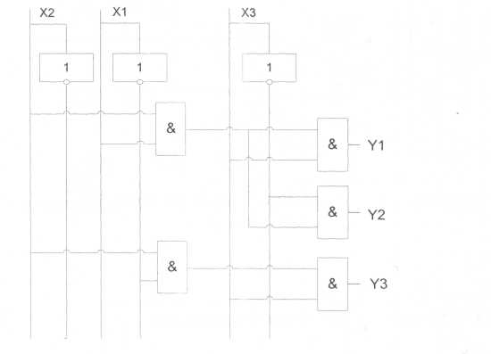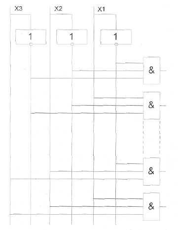 Пирамидальные дешифраторы отличаются тем, что каждая конституента единицы формируется как конъюнкции одной из конституент предыдущего каскада и одного из разрядов входного числа, еще не использовавшегося для формирования конституент. Принцип построения пирамидального дешифратора иллюстрируется на рис. 3. Из схемы видно, что в этом случае можно использовать элементы на два входа.