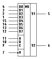 1-4 – входы информационные D3-D1; 5 – выход Y1; 6 – выход Y2; 7 – вход разрешения; 8 – общий; 9 – вход C; 10 – вход B; 11 – вход A; 12-15 – входы информационные D7-D4; 16 – напряжение питания;