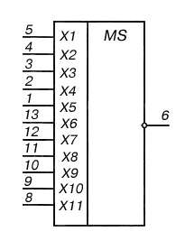 1 – вход X5; 2 – вход X4; 3 – вход X3; 4 – вход X2; 5 – вход X1; 6 – выход Y; 7 – общий; 8 – вход X11; 9 – вход X10; 10 – вход X9; 11 – вход X8; 12 – вход X7; 13 – вход X6; 14 – напряжение питания;