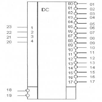 Назначение выводов: 1, 2, 3, 4, 5, 6, 7, 8, 9, 10, 11, 13, 14, 15, 16, 17 – выходы Yl, Y2, Y3, Y4, Y5, Y6, Y7, Y8, Y9, Y10, Yll, Y12, Y13, Y14, Y15, Y16; 12 – общий; 18, 19 – стробирующие входы XI, Х2; 20,21,22,23 – информационные входы Х6, Х5, Х4, ХЗ; 24 – напряжение питания.