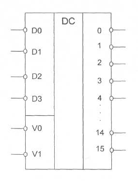 Дешифраторы входят в состав нескольких серий ТТЛ. В качестве примера приведено условное обозначение микросхем дешифратора 4x16 типа К155ИДЗ (рис. 4). Если на обоих входах разрешение VO=V1=0, микросхема работает как дешифратор. Потенциал VO=1, Vl=l устанавливает уровень "1" всех выходах независимо от состояния входов. Данные микросхемы позволяют наращивать разрядность дешифратора.