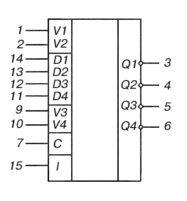 1 – управление выходами V1; 2 – управление выходами V2; 3 – выход первого разряда Q1; 4 – выход второго разряда Q2; 5 – выход третьего разряда Q3; 6 – выход четвертого разряда Q4; 7 – вход синхронизации C; 8 – общий; 9 – разрешение данных V3; 10 – разрешение данных V4; 11 – вход четвертого разряда D4; 12 – вход третьего разряда D3; 13 – вход второго разряда D2; 14 – вход первого разряда D1; 15 – вход установки нуля; 16 – напряжение питания;