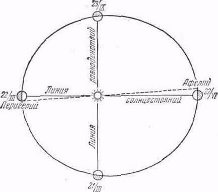 Самая близкая к Солнцу точка орбиты любой планеты называется перигелием (для Земли это 147 002 000 км), самая далекая— афелием (для Земли 152 006 000 км). Их соединяет линия апсид, совпадающая с большой осью эллипса планетной орбиты. Положение линии апсид определяется гелиоцентрической долготой перигелия. В 1960 г. долгота перигелия земной орбиты близка к 102°. Вследствие медленного вращения линии апсид долгота перигелия возрастает на 61",9 в год. В настоящую эпоху Земля проходит через перигелий 2—5 января, а через афелий 1—5 июля. Скорость движения Земли различна в разных частях орбиты. Средняя скорость движения Земли по ее орбите около 30 км/сек или 100 000 км/час; на длину своего поперечника Земля продвигается за семь минут.