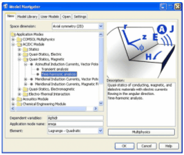COMSOL Multiphysics - это мощная интерактивная среда для моделирования и расчетов большинства научных и инженерных задач основанных на дифференциальных уравнениях в частных производных (PDE) методом конечных элементов [3]. С этим программным пакетом есть возможность расширять стандартные модели, использующие одно дифференциальное уравнение (прикладной режим) в мультифизические модели для расчета связанных между собой физических явлений. Расчет не требует глубокого знания математической физики и метода конечных элементов. Это возможно благодаря встроенным физическим режимам, где коэффициенты PDE задаются в виде понятных физических свойств и условий, таких как: электрическая проводимость, плотность тока, относительная магнитная проницаемость, частота тока и т.п. в зависимости от выбранного физического раздела. Преобразование этих параметров в коэффициенты математических уравнений происходит автоматически. Взаимодействие с программой возможно стандартным способом – через графический интерфейс пользователя (GUI), либо программированием с помощью скриптов на языке COMSOL Script или языке MATLAB.