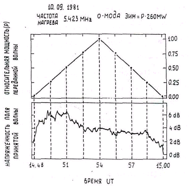 Дополнительную проверку того, не является ли излучение второй гармоники излучением нагревного стенда позволила провести сама природа. В эксперименте 6.03.84 г. МПЧ на трассе Тромсе-Мурманск изменялась во время сеанса от 13 МГц до 6 МГц, превышая в начале сеанса частоту второй гармоники и затем уменьшаясь становилась ниже этой частоты. Если бы при этом сигнал второй гармоники излучался нагревным стендом, то в начале сеанса уровень принимаемого сигнала должен быть на несколько порядков выше, чем в конце. В эксперименте же уровни сигнала второй гармоники как в начале, так и в конце сеанса, оставались одинаковыми.