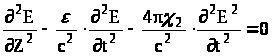 Рассмотрим случай, когда в ионосфере распространяется одна мощная волна накачки (или две радиоволны с одинаковыми частотами). Считаем распространение вертикальным (вдоль оси Z) и ограничимся учетом лишь квадратичной зависимости поляризуемости Р от поля волны накачки. При таких предположениях Волновой процесс в ионосферном слое будет удовлетворять уравнению: