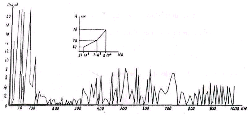 Все эти явления приводят к значительным потерям энергии сигнала в ионосфере. На рисунке показана зависимость уровня отраженного от ионосферы сигнала от эффективной мощности (произведение мощности передатчика на коэффициент усиления антенны) падающей на ионосферу волны. Из рисунка видно, что при линейном нарастании мощности от 0 до 260МВт напряженность поля принятой волны прекращала возрастать примерно от 60МВт, оставалась на максимальной величине до значения мощности около 130МВт и затем уменьшалась до уровня, который на возрастающей части достигался всего лишь при 20МВт. То есть увеличение эффективной мощности передающих средств свыше некоторого порогового значения не увеличивает потенциала радиотехнической системы, так как резко возрастает мощность, теряемая в ионосфере.