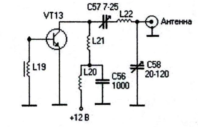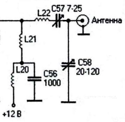 L21, L22, C57, C58 – колебательный контур. Согласует выходной каскад передатчика с нагрузкой.