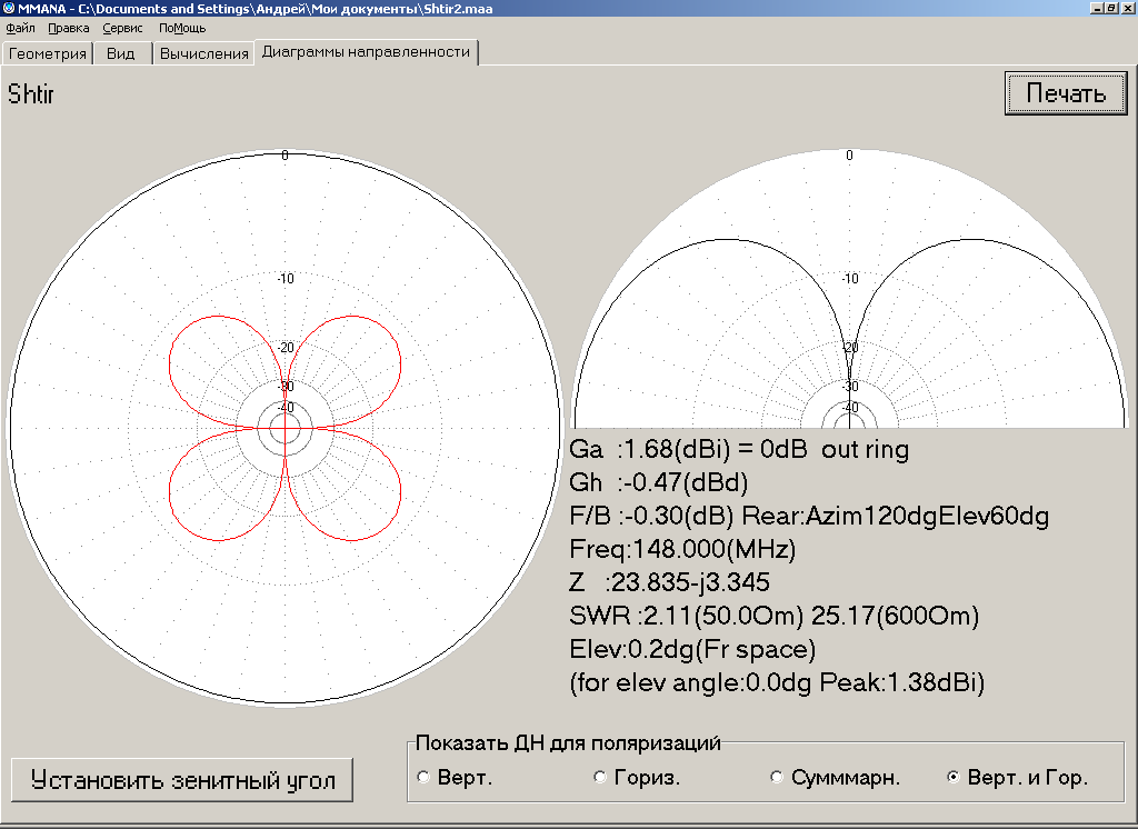 Рис. 8. Результат работы программы (вкладка «Диаграммы направленности»)
