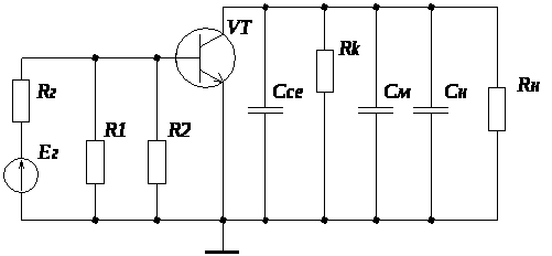 Эквивалентная схема каскада для высоких частот (ВЧ) не будет содержать конденсаторов C>1>, C>e> и C>c>, так как их сопротивления на высокой частоте близко к нулю.