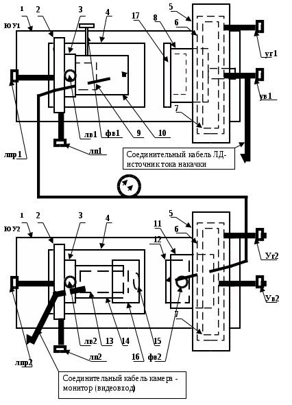 На плате 3 узла, осуществляющего линейное перемещение в юстировочном узле ЮУ2 (рис2.1, 2.3), укреплен цилиндр 14 с внутренним отверстием. В нем крепится телекамера 13. На внешней поверхности цилиндра 14 имеется резьба (М 400,5). По ней наворачивается оправка 16 с объективом 15. Перемещение оправки 16 по резьбе вдоль цилиндра 14 позволяет производить настройку изображения, формируемого телекамерой на экране монитора М (рис. 2.1) в том случае, если используется объектив телекамеры. На эскизе (рис. 5) показан кабель, соединяющий телекамеру с монитором.