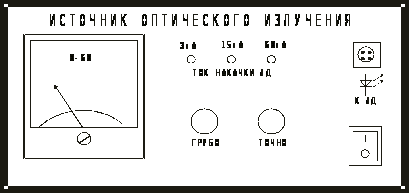 – регулировки тока накачки с помощью потенциометров «грубо», «точно», ручки которых выведены на лицевую панель. Изменение тока накачки позволяет изменять мощность излучения лазерного диода;