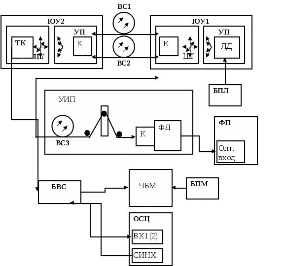 С элементами оптической схемы лабораторной установки коннекторы ВС соединяются с помощью специальных оправок (К), которые крепятся в узлах юстировочных устройств (их описание приводится ниже).