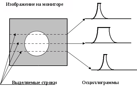 10. Включить питание осциллографа. Его органы управления установлены в положение, при котором осциллограмма на его экране соответствует одной из строк видеосигнала, наблюдаемого на экране монитора.