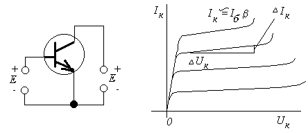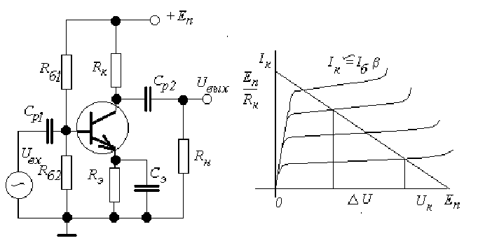 В схеме ОЭ входной сигнал подаётся на базу, а выходной сигнал снимается с коллектора. Схема и выходные характеристики изображены на рис.1Видно, что схема стала очень сложной. Однако главное, что здесь есть – это резистор Rк , который определяет коэффициент усиления по напряжению, и который составляет от единиц кОм до МОм (чем больше этот резистор, тем больше усиление). Все остальные элементы более или менее условны.Прежде всего Rэ необходимо для термостабилизации транзистора. Это осуществляется за счёт обратной связи по постоянному току, которую мы обсудим позже.
