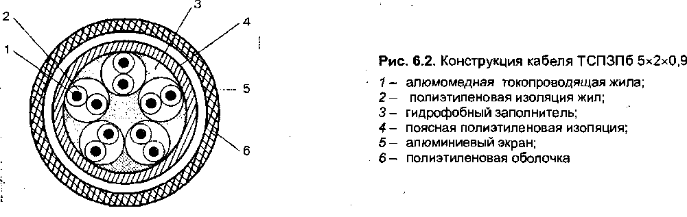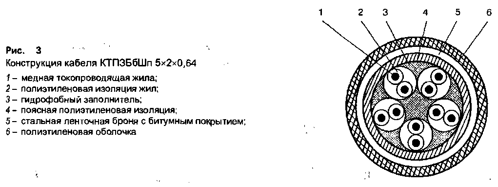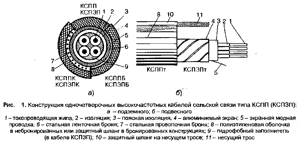 Конструктивные параметры соответствующих марок герметизированных и не герметизированных кабелей унифицированы. Кабели содержат четыре медные жилы со сплошной полиэтиленовой изоляцией, скрученные в звездную четверку с шагом не более 150 мм и 170 мм. В четверке две жилы, расположенные по диагонали, образуют пару. Изоляция обеих жил первой пары имеет натуральный цвет, второй пары - синий цвет. Поверх скрученного сердечника накладываются последовательно поясная изоляция в виде трубки из полиэтилена и экран из алюминиевой отожженной ленты с перекрытием не менее 10%. Под экраном должна быть проложена продольно медная луженая проволока диаметром 0,3-0,4 мм. Свободный объем под поясной изоляцией герметизированных кабелей заполнен гидрофобным компаундом, который вводится в сердечник одновременно с наложением поясной изоляции. Поверх экрана накладываются: в небронированных кабелях - трубчатая полиэтиленовая оболочка, в бронированных - КСГШБ - броня из стальной ленты с битумным покрытием, в кабелях КСППК - ПВХ лента, оцинкованные круглые стальные проволоки и защитный полиэтиленовый шланг. Самонесущие кабели имеют встроенный несущий трос в общей оболочке с сердечником, образующий конструкцию «восьмерка».
