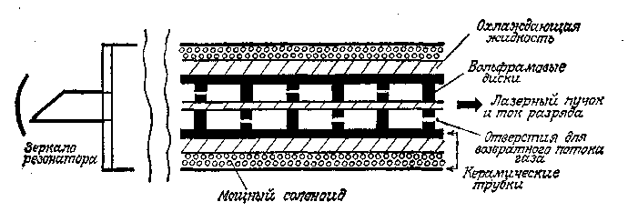 На рис.2 приведена схема устройства современного мощного (≥1 Вт) аргонового лазера. Заметим, что как плазменный ток, так и лазерный пучок ограничиваются металлическими (вольфрамовыми) дисками, помещенными в керамическую (ВеО) трубку большего диаметра. Использование такой теплопроводной и изолирующей металлокерамической комбинации необходимо для того, чтобы обеспечить хорошую теплопроводность трубки и в то же время ослабить проблемы, связанные с эрозией вследствие высокой температуры ионов. Диаметр центральных отверстий в дисках делается небольшим (~ 2 мм),