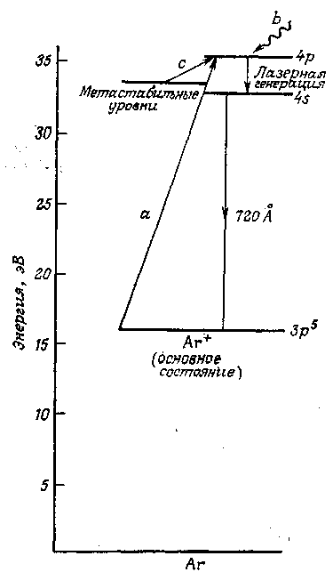 Упрощенная схема участвующих в генерации уровней энергии в аргоновом лазере приведена на рис.1 [3, стр.354]. Основное состояние иона Аr+ получается