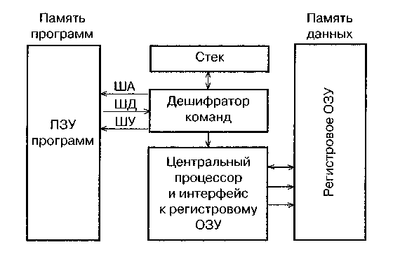Дело в том, что, судя по опыту использования МПС для управления различными объектами, для реализации большинства алгоритмов управления такие преимущества фон-неймановской архитектуры как гибкость и универсальность не имеют большого значения. Анализ реальных программ управления показал, что необходимый объем памяти данных МК, используемый для хранения промежуточных результатов, как правило, на порядок меньше требуемого объема памяти программ. В этих условиях использование единого адресного пространства приводило к увеличению формата команд за счет увеличения числа разрядов для адресации операндов. Применение отдельной небольшой по объему памяти данных способствовало сокращению длины команд и ускорению поиска информации в памяти данных.