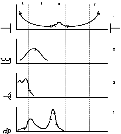 Рисунок 1 - Распределение тепла в отдельных слоях ткани (а, д - жировая; б, г - мышечная; в - костная) при воздействии высокочастотными факторами (методами):1 - УВЧ-терапия, 2 - индуктотермия, 3 - СВЧ-терапия, 4 - ультразвук