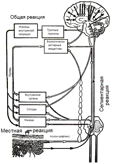 Вследствие местных сдвигов, являющихся источником длительного раздражения, а также благодаря непосредственным физико-химическим изменениям в нервных рецепторах и других нервных образованиях, в ответ на физиотерапевтическое воздействие формируется общая ответная реакция организма. Она носит, как уже подчеркивалось, системный характер и имеет адаптационно-компенсаторную направленность. Ведущим компонентом этой целостной реакции организма является рефлекторный акт, нервное и гуморальное звенья которого теснейшим образом связаны между собой. Надо подчеркнуть, что тесная взаимосвязь местных и общих реакций во многом обеспечивается благодаря особенностям структуры и функций кожи, являющейся входными воротами для большинства физиотерапевтических факторов.