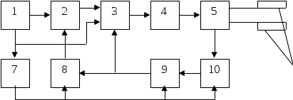 Формирование адекватной длительности стимулов, при которой достигается минимизация пороговой энергии стимуляции и поддержание этих условий в процессе длительного воздействия, требует контроля величины времени релаксации тока в зоне расположения электродов и введения управления в формирователь длительности стимулов. Структурная схема, реализующая данный принцип управления длительностью стимула, показана на рис. 5. Задающий генератор I определяет частоту следования стимулов, длительность которых задается в управляемом формирователе 2, связанном через коммутатор 3 и усилитель 4 с электродами 5, расположенными на участке биологической ткани. Сигнал тактового генератора 6, синхронизированный с импульсами стимуляции, переводит устройство в режим управления. В этом режиме на электроды 5 подается сигнал с формирователя измерительного импульса 7, представляющий собой импульс с прямоугольной огибающей. Возникающее на электродах под действием измерительного импульса экспоненциально возрастающее напряжение поступает на измеритель переходного процесса 8, который формирует временной интервал, соответствующий времени нарастания входного напряжения, т.е. контролируемой величине времени релаксации тока. Для сохранения измеренного значения на весь период управления служит запоминающее устройство 9, сбрасываемое в начале каждого такта управления сигналом тактового генератора 6. Выход запоминающего устройства 9 через устройство управления 10 связан с управляющим входом формирователя длительности стимула 2. Таким образом, длительность стимулов в режиме стимуляции устанавливается в соответствии с измеренным значением времени релаксации тока в тканях в предыдущем периоде управления. Период управления выбирается достаточно большим по сравнению с длительностью измерительного импульса и периода стимуляции. Для отслеживания изменений релаксационных свойств ткани в процессе стимуляции достаточно выбрать период управления равным 2...4 с, а длительность измерительного импульса 1,5...2,0 мс. Достоинством данной схемы является использование одной пары электродов для стимуляции и контроля параметров, что упрощает построение технического звена БТС.