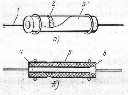 Трубчатая конструкция характерна для некоторых керамических конденсаторов (рис.2, а, б). Серебряные обкладки 4 и 5 наносят вжиганием на внешнюю и внутреннюю поверхности керамических трубок 6, имеющих толщину стенок 0,25 мм и более. Для присоединения гибких проволочных выводов 1 внутреннюю обкладку выводят на внешнюю поверхность трубки и создают между ней и внешней обкладкой изолирующий «поясок» 2. В миниатюрных конденсаторах выводы припаивают к обкладкам, не закручивая и не создавая перехода. Трубчатые конденсаторы имеют влагостойкое эмалевое покрытие, по цвету которого определяют группу их стабильности емкости.