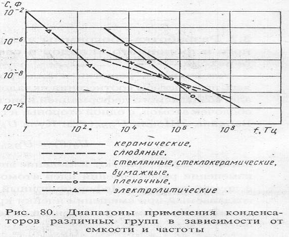 Эквивалентная схема бумажных и плёночных низкочастотных конденсаторов аналогична схеме, показанной на рис. 8, а. Основным ограничением применения электролитических конденсаторов на определённой частоте являются потери в электролите Rэ. Так, из схемы, показанной на рис. 8, б, видно, что область возможного применения электролитических конденсаторов ограничивается диапазоном от постоянного тока и звуковых частот.