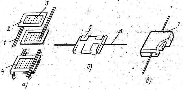 Пакетная конструкция характерна для слюдяных (рис.1,а - в), стеклоэмалевых, стеклокерамических и некоторых керамических конденсаторов. Пакет 4 собирают из чередующихся пластинок 2 слюды и напыленных металлизированных обкладок 3, соединяемых в общий контакт фольговыми полосками 1 по торцам пакета, к которому припаивают выводы 6 в виде проволочек или лент. Обкладки стеклоэмалевых, стеклокерамических и некоторых керамических конденсаторов выполняют вжиганием пасты на основе серебра. Пакетную конструкцию опрессовывают и покрывают влагозащитной эмалью.
