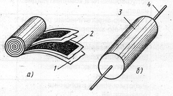 а – конструкция, б – общий вид; 1 – бумага, 2 – фольговые обкладки, 3 – герметичный корпус, 4 – проволочный вывод.
