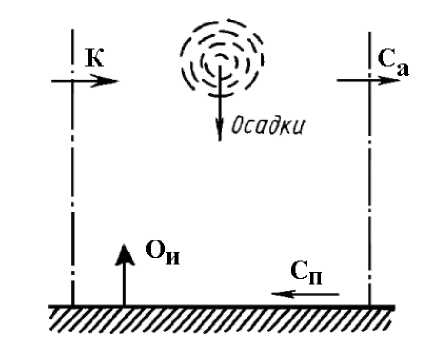 Внутренний влагооборот (рисунок 2) определяется количеством внешней влаги (К), которая частично выпадает на территорию в виде осадка O, а частично выносится за ее пределы атмосферным стоком C>a>. Часть выпавших осадков O>и> испаряется, а часть образует поверхностный сток С>п>. При гидрометеорологических наблюдениях измеряют количество выпавших осадков и испарившейся влаги. Остальные составные части влагооборота не учитывают.