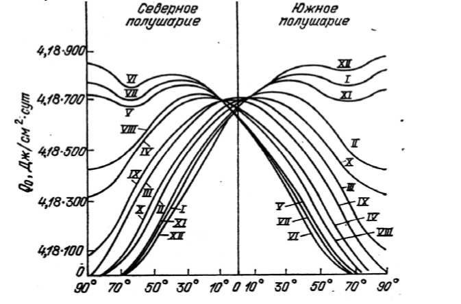 Рисунок 1 Среднемесячные суточные значения суммарной солнечной радиации при безоблачном небе в зависимости от широты местности и времени года (I-XII- месяцы года)