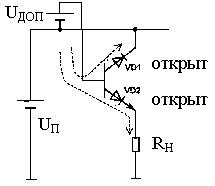 Что такое состояние насыщения лучше всего пояснять, представив транзистор в виде двух диодов (рис.1). В ненасыщенном состоянии диод VD1 закрыт. В состояние насыщения транзистор можно перевести, «подняв» потенциал базы выше потенциала коллектора с помощью, например, дополнительного источника напряжения U>ДОП>. В этом случае произойдет отпирание диода VD2 и транзистор перейдет в состояние насыщения.