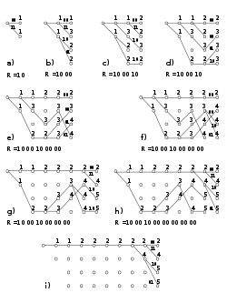 Пользуясь решетчатой диаграммой кодера, попытаемся, приняв некоторый сегмент r, проследить наиболее вероятный путь кодера. При этом для каждого сечения решетчатой диаграммы будем отмечать меру расходимости пути каждому ее узлу. Предположим, что передана кодовая последовательность U = (00000000…), а принятая последовательность имеет вид r = (10001000…), то есть в первом и в третьем кадрах кодового слова возникли ошибки. Как мы уже убедились, процедура и результат декодирования не зависят от передаваемого кодового слова и определяются только ошибкой, содержащейся в принятой последовательности. Поэтому проще всего считать, что передана нулевая последовательность, то есть U = (00000000…). Приняв первую пару символов (10), определяется мера расходимости для первого сечения решетки, приняв следующую пару символов (00), — для второго сечения и т.д. При этом из входящих в каждый узел путей оставляем путь с меньшей расходимостью, поскольку путь с большей на данный момент расходимостью уже не сможет стать в дальнейшем короче. Заметим, что для рассматриваемого примера начиная с четвертого уровня метрика (или мера расходимости) нулевого пути меньше любой другой метрики. Поскольку ошибок в канале больше не было, ясно, что в конце концов в качестве ответа будет выбран именно этот путь. Из этого примера также видно, что выжившие пути могут достаточно долго отличаться друг от друга. Однако на шестом-седьмом уровне первые семь ребер всех выживших путей совпадут друг с другом. В этот момент согласно алгоритму Витерби и принимается решение о переданных символах, так как все выжившие пути выходят из одной вершины, т.е. соответствуют одному информационному символу.