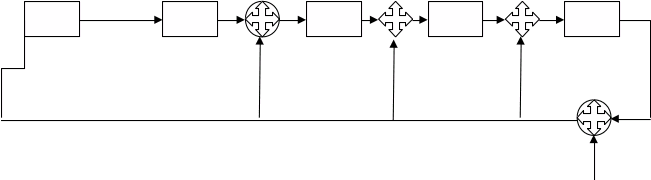 Таким образом, построим кодер циклического кода для чего воспользуемся правилом: если пронумеровать ячейки регистра возрастающими степенями Х (Х0,Х1,...,Хr+1) - то сумматоры включаются на входах тех ячеек, которые соответствуют ненулевым членам образующего полинома, кроме младшей ячейки Х0. Также добавим, что для ввода разрядов делимого схему устройства деления необходимо дополнить еще одним сумматором по модулю два, включенным в цепь обратной связи таким образом, что один вход подключен к выходу старшей ячейки регистра, на второй вход подаются разряды делимого, а выход подключен к цепи обратной связи. Таким образом, общее количество сумматоров по модулю два получается на единицу меньше веса образующего числа. Схема устройства деления на образующий полином Р(Х)=X4+X3+X2+1 изображена на рис. 2.1: