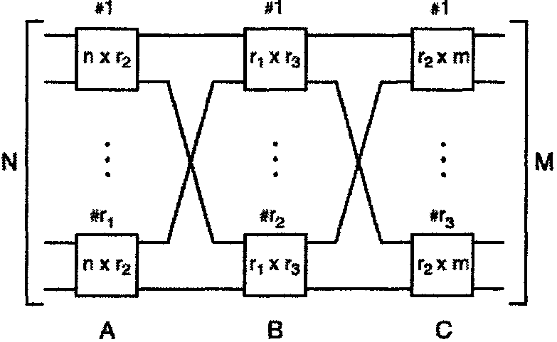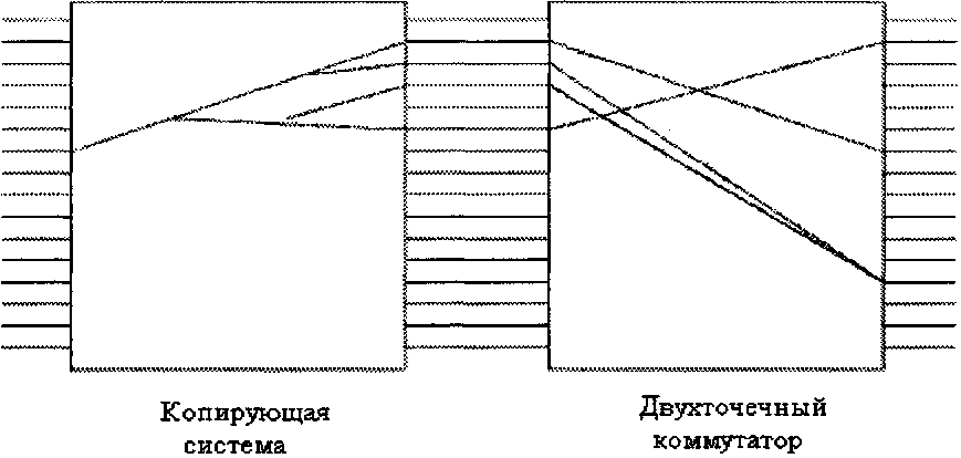 Коммутационной структуре матричного типа требуется N2 ключей, что усложняет работу такой коммутационной структуры при увеличении N (свыше двух десятков). Поэтому были предприняты поиски альтернативных коммутационных структур, основанных на многокаскадных сетях [5,6].