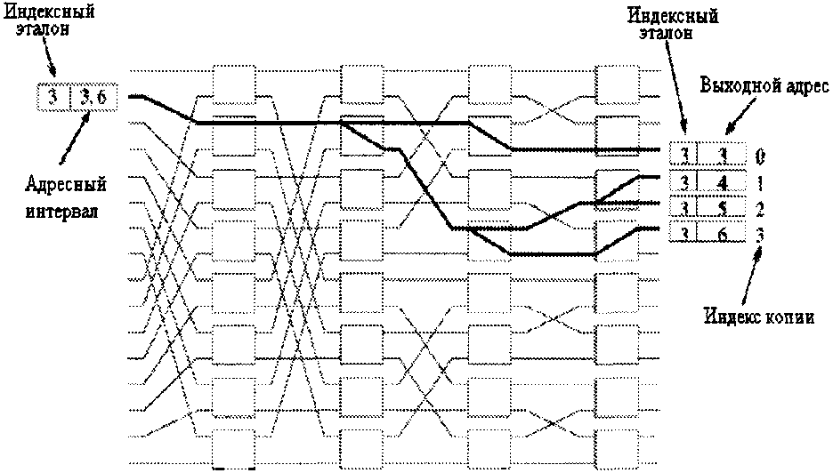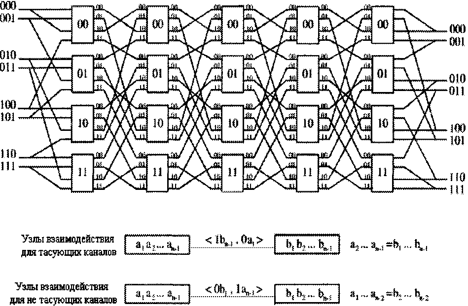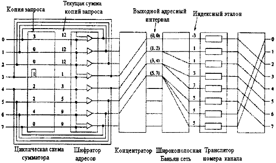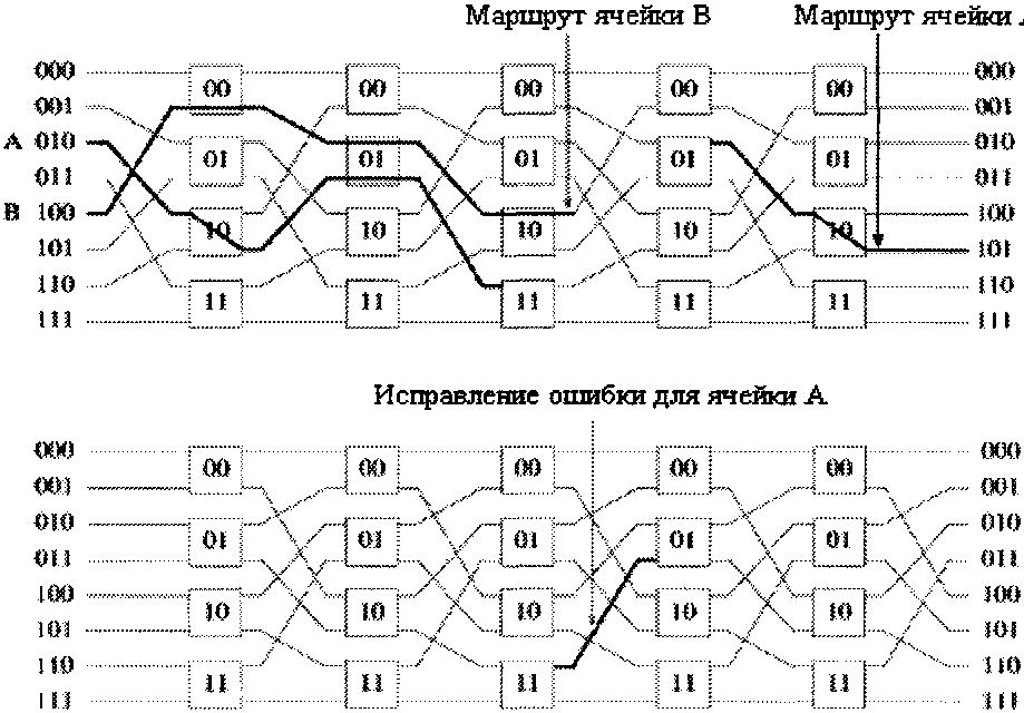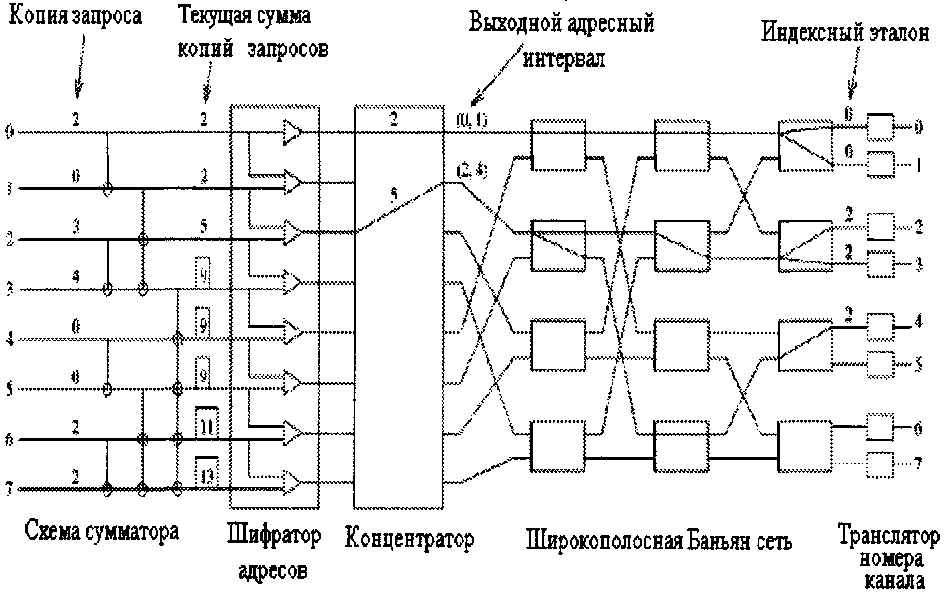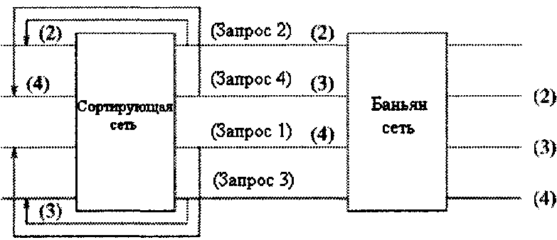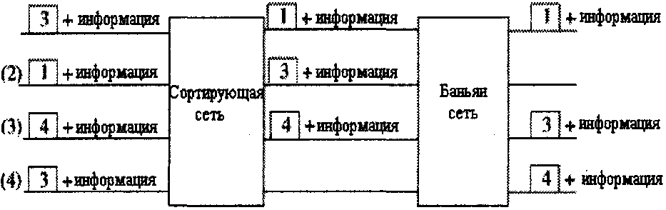 Однако в каждом временном интервале для передачи одного пакета с входа на выход требуются не все переключатели, имеющиеся в дереве. Возможно совместное использование переключателей несколькими разетвителями. Путем добавления пар входных каналов к уже имеющейся структуре можно соединить между собой N входов и N выходов, используя только (N / 2)log2 N элементарных двоичных переключателей.
