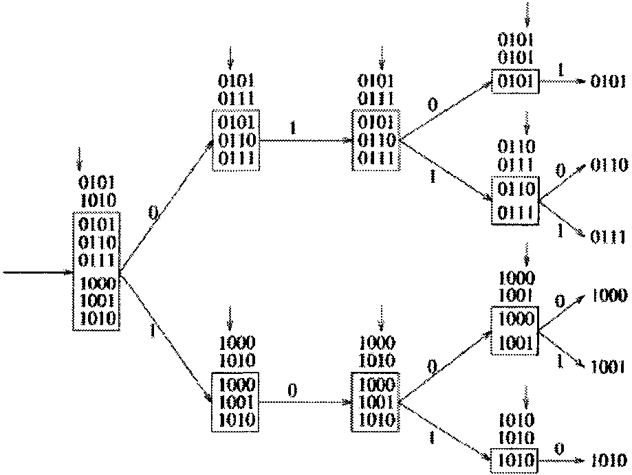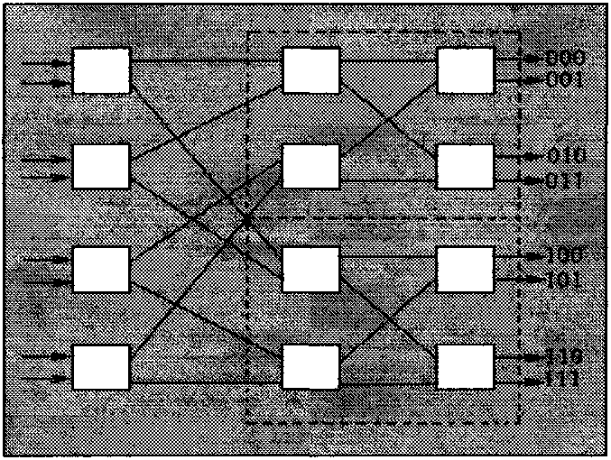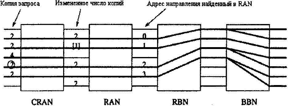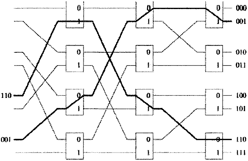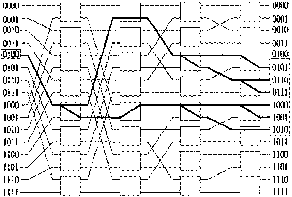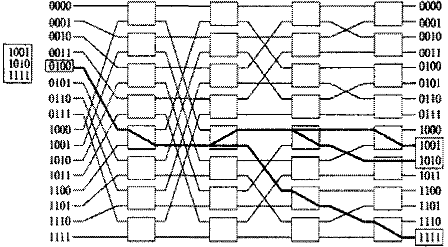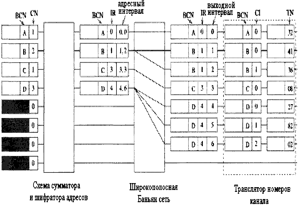 Однако в каждом временном интервале для передачи одного пакета с входа на выход требуются не все переключатели, имеющиеся в дереве. Возможно совместное использование переключателей несколькими разетвителями. Путем добавления пар входных каналов к уже имеющейся структуре можно соединить между собой N входов и N выходов, используя только (N / 2)log2 N элементарных двоичных переключателей.