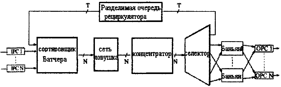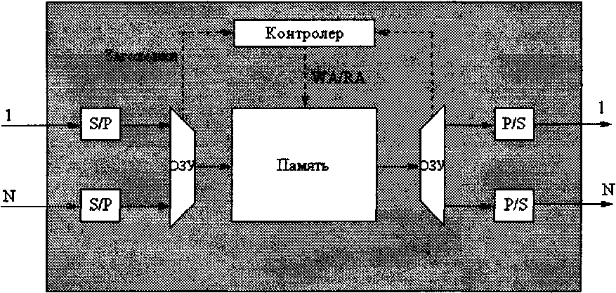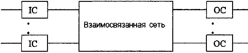 Поступившая ячейка синхронизирована в соответствии с внутренним временем входного контроллера (1C). Выходной контроллер (ОС) транспортирует ячейки, полученные от взаимосвязной сети, по назначению. Входные и выходной контроллеры попарно соединены сетью взаимосвязи.