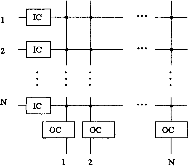 Коммутационный элемент является основной частью коммутатора [4,5,6]. На порту информация поступившей ячейки анализируется и ячейка затем направляется на определенный выход. Обычно коммутационный элемент состоит из взаимосвязной сети, выходного контроллера (1C) для каждой входящей линии и выходного контроллера (ОС) для каждой исходящей линии (рисунок 1.1). Для предупреждения чрезмерной потери ячеек в случае внутренней коллизии (противоречия) (2 или более ячейки «соревнуются» на одном и том же выходе одновременно), внутри коммутационных элементов необходимо предусматривать размещение буферов.